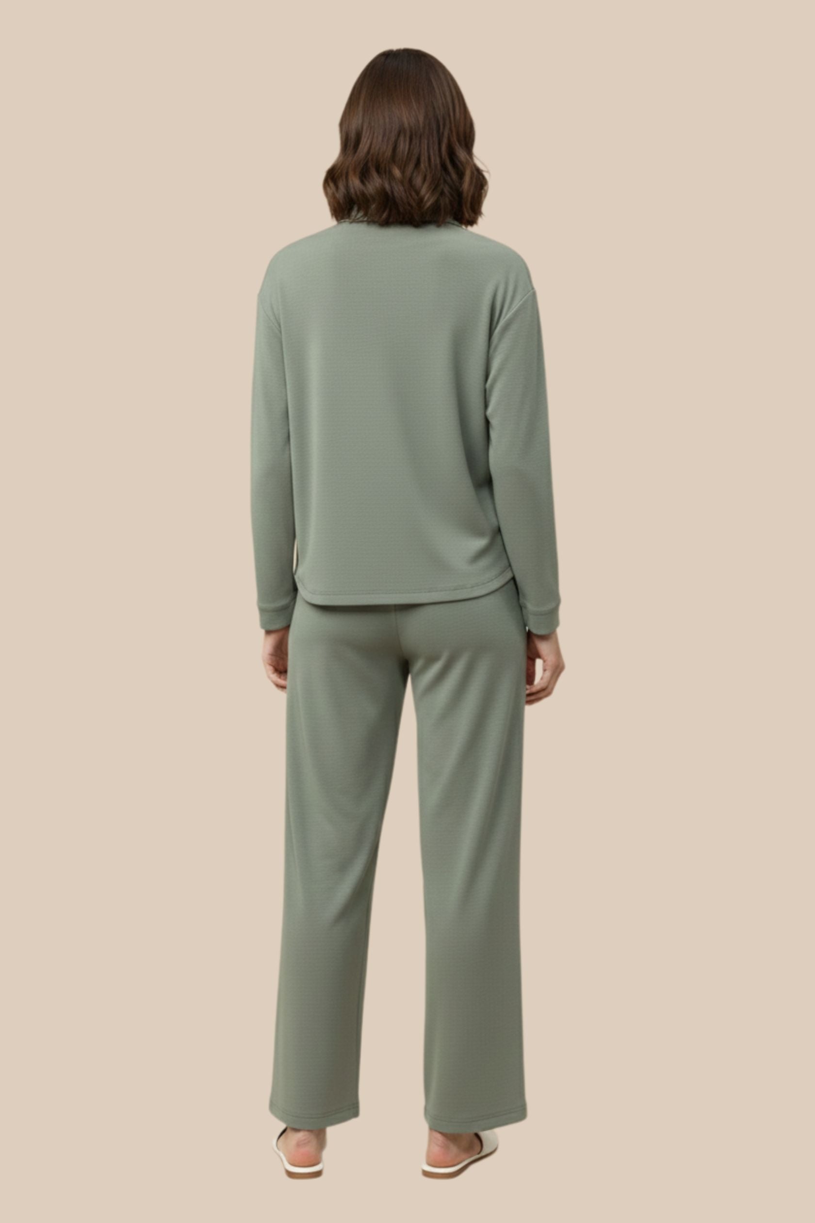 This elegant ladies’ co-ord set is crafted from premium waffle knit fabric, offering a soft feel with a refined texture. Designed in a soothing moss green shade, it combines comfort with a modern silhouette, making it perfect for everyday wear and effortless styling.