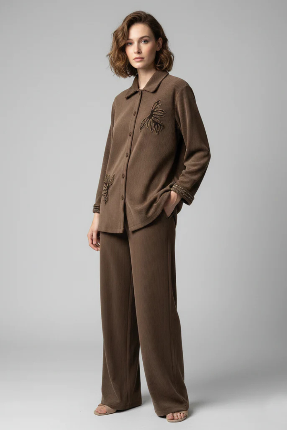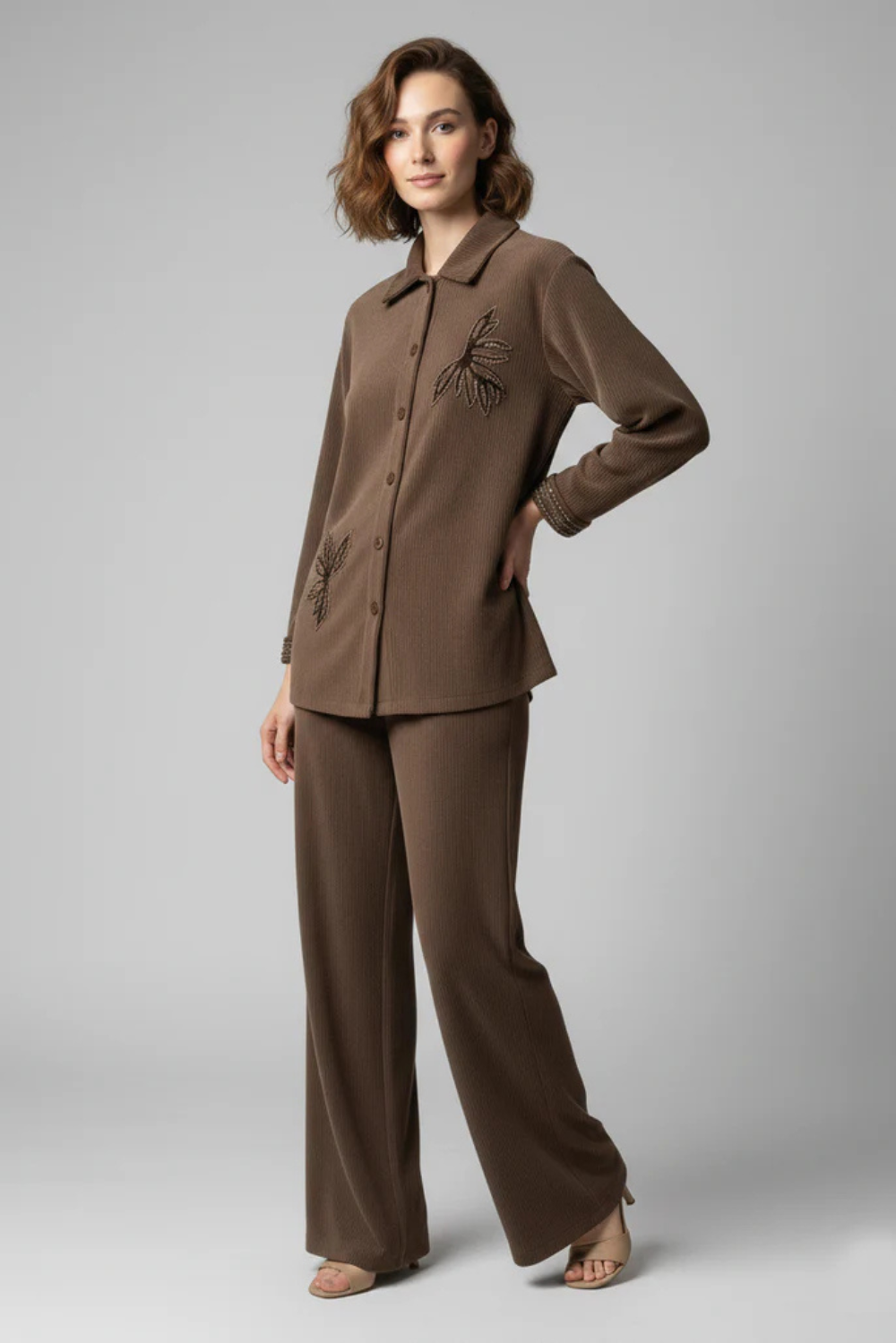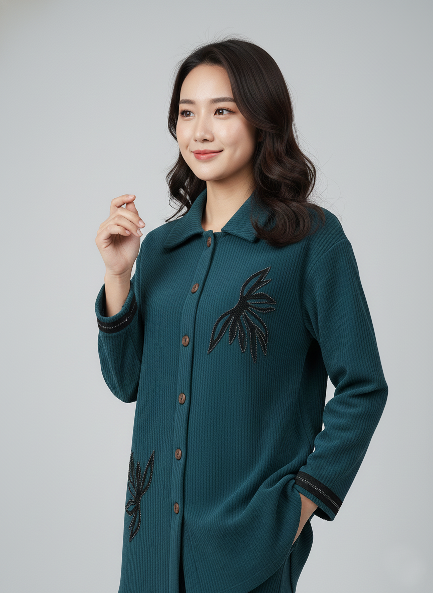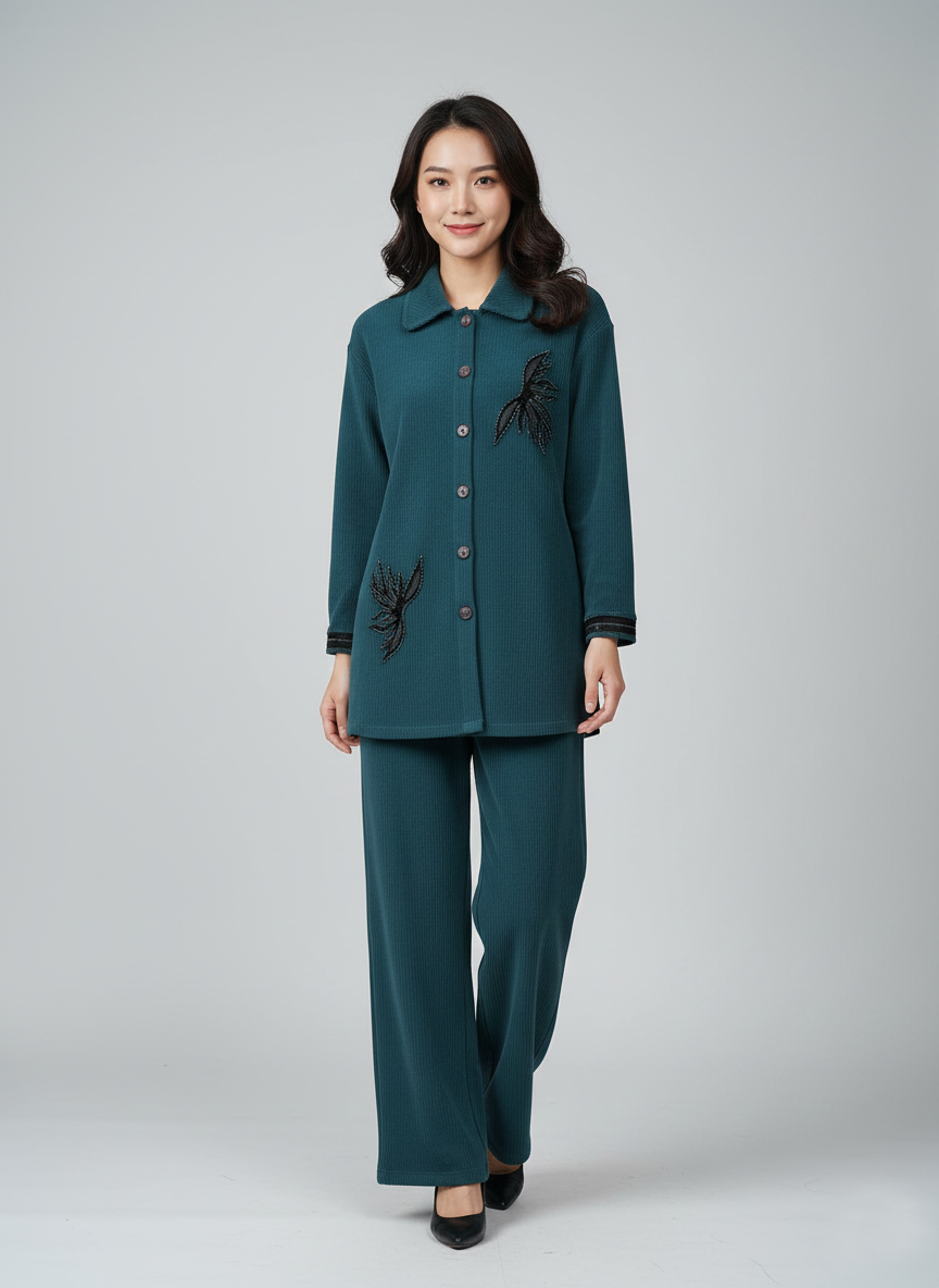 This refined ladies’ co-ord set is crafted from soft corduroy fabric, offering a rich texture and comfortable warmth. Designed with a modern silhouette, it delivers an effortlessly polished look suitable for everyday wear and relaxed evening outings.